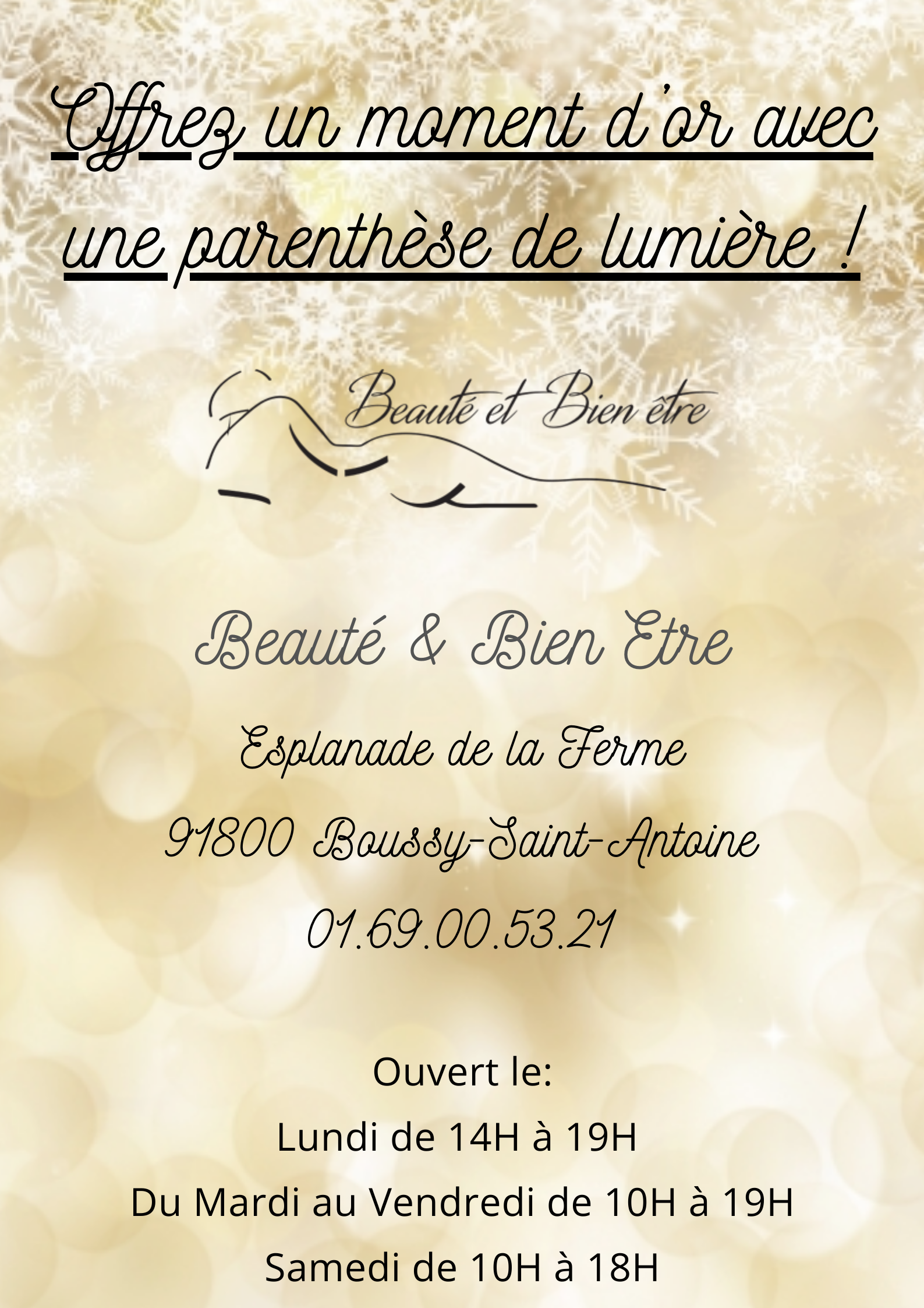 L’institut SPA Beauté et Bien-être, situé esplanade de la Ferme à Boussy-St-Antoine est un monde de douceur et de ressourcement qui enchante les sens avec sa carte de soins constamment enrichie et une équipe de professionnelles attentives et compétentes où règne une ambiance chaleureuse, souriante et reposante.